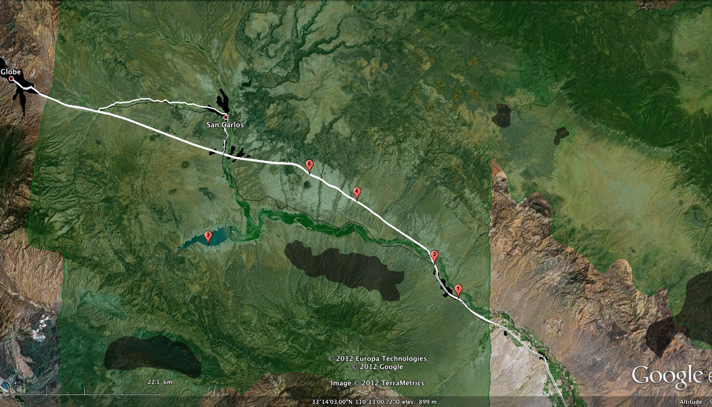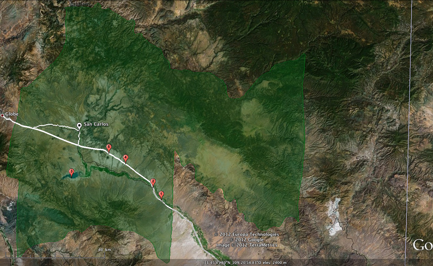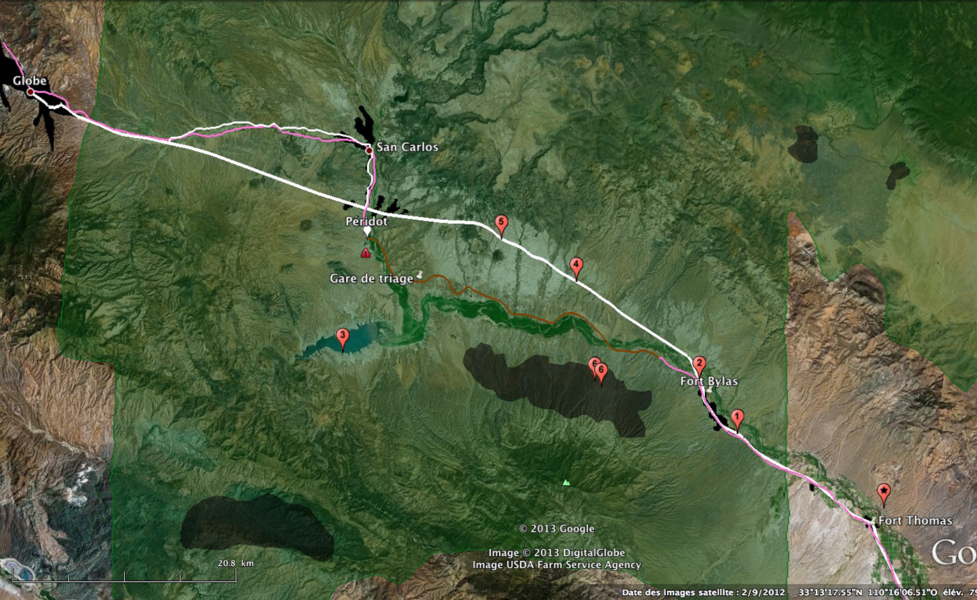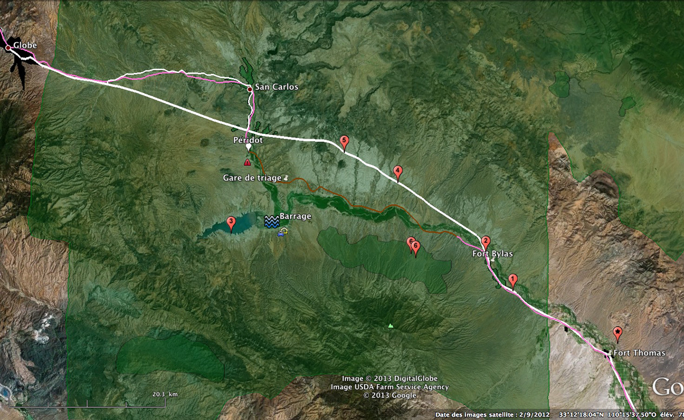 (Frontière de la Réserve Apache de San Carlos et vue de la N70.)